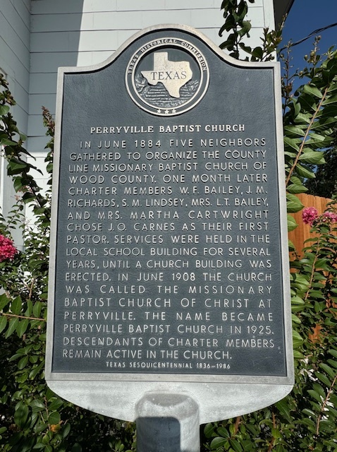 Charter members for Perryville Baptist were W.F.Bailey, James M. Richards, S.M. Lindsey, Mr. L.T. Bailey and Mrs. Martha Cartwright. Missionary Baptist Church at County Line was chosen originally as the name for the church. The first meetings were held in the local school building.